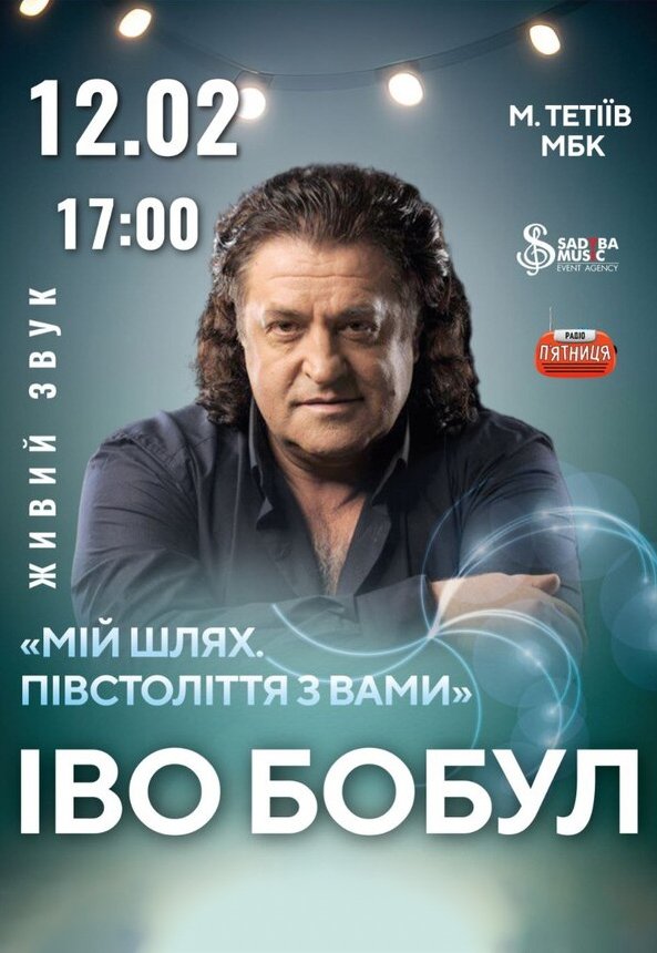 Иво Бобул "Мій шлях. Півстоліття з вами" состоится 12 февраля 2025, 17:00, среда в Дом культуры. С помощью сервиса internet-bilet.ua, Вы сможете с легкостью забронировать, заказать и купить билеты на интересующий Вас концерт, спектакль, оперу, балет, мастер-классы, спортивные и детские мероприятия, оплатив их самым удобным для Вас способом: через интернет банковской картой VISA/MasterCard, наличными или курьером, если сделаете заказ билета c доставкой.