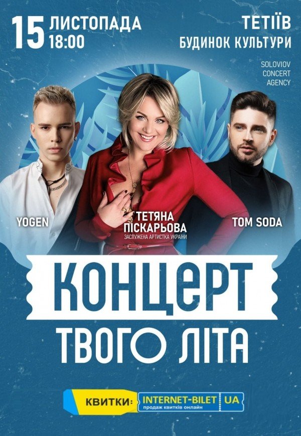 Концерт твоего лета состоится 15 ноября 2024, 18:00, пятница в Дом культуры. С помощью сервиса internet-bilet.ua, Вы сможете с легкостью забронировать, заказать и купить билеты на интересующий Вас концерт, спектакль, оперу, балет, мастер-классы, спортивные и детские мероприятия, оплатив их самым удобным для Вас способом: через интернет банковской картой VISA/MasterCard, наличными или курьером, если сделаете заказ билета c доставкой.